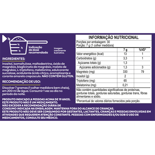 Ingredientes: Inositol, isomaltulose, maltodextrina, óxido de magnésio, bisglicinato de magnésio, malato de magnésio, L-triptofano, melatonina, aromatizante, acidulante ácido cítrico e edulcorante sucralose. NÃO CONTÉM GLÚTEN
