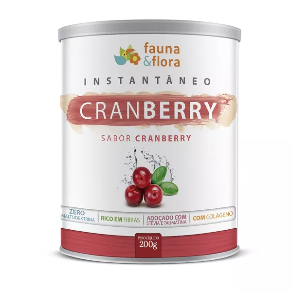 O Chá Instantâneo de Cranberry Fauna & Flora 200g é um pó solúvel pronto para o consumo, rico em compostos fenólicos, proantocianidinas, antoacinidinas, flavonóides, triterpenos, vitamina C e K. É um produto adoçado com Stévia e Taumatina, que possui vantagens como a ausência sabor residual amargo, não possui calorias, não provoca cáries e não possui restrições quanto ao seu uso. Possui ainda em sua formulação colágeno hidrolisado e é rico em fibras. Pode ser consumido quente ou gelado.