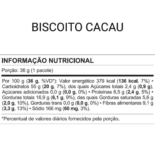 Ingredientes: Farinha de trigo enriquecida com ferro e ácido fólico, gordura vegetal, amido, polidextrose (fibra alimentar), cacau em pó, leite em pó, sal, edulcorantes: maltitol, sucralose e acessulfame de potássio, fermentos químicos: bicarbonato de amônio, pirofosfato ácido de sódio e bicarbonato de sódio, emulsificante: lecitina de soja, aromatizante.