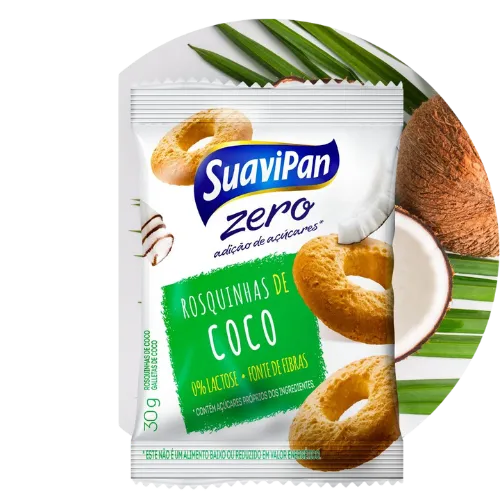 As Rosquinhas de Coco Zero Açúcar SuaviPan são uma opção deliciosa e saudável, sem adição de açúcares e zero lactose. Podem ser consumidas por pessoas com diabetes ou por quem busca uma alimentação equilibrada. Formuladas com farelo de aveia, um cereal rico em fibras, essas rosquinhas ajudam no controle do colesterol e no funcionamento do intestino, promovendo mais saúde e bem-estar.