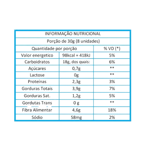 Ingredientes: Farinha de trigo enriquecida com ferro e ácido fólico, gordura vegetal, clara de ovo, coco ralado, leite em pó integral para dietas com restrição de lactose, amido de milho, farelo de aveia, maltodextrina, fibra alimentar: polidextrose, umectante: sorbitol, estabilizante: maltitol, fermentos químicos: bicarbonato de sódio e pirofosfato ácido de sódio, emulsificantes: mono e diglicerídeos de ácidos graxos e lecitina de soja, aromatizante, conservador: propionato de sódio, edulcorantes: acessulfame de potássio e sucralose.