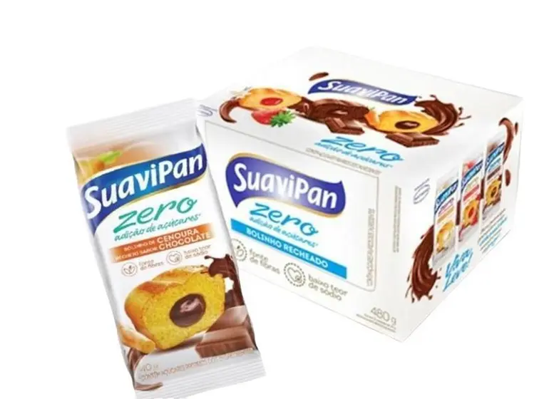 Bolinhos Zero Açúcar SuaviPan – Cenoura com recheio de Chocolate oferece todo o sabor e maciez dos melhores bolos, sem adição de açúcares. Rico em fibras, possui baixo teor de sódio, baixas calorias e é isento de gorduras trans, sendo uma opção deliciosa e equilibrada para o dia a dia.