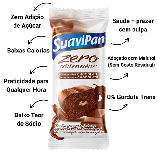 Bolinhos Zero Açúcar SuaviPan – Chocolate com Chocolate é uma combinação perfeita para quem ama o sabor intenso do chocolate. Sem adição de açúcares, com alto teor de fibras, baixas calorias, baixo teor de sódio e isento de gorduras trans, é a escolha ideal para uma alimentação equilibrada e saborosa.