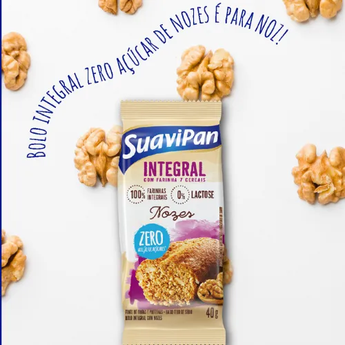A Linha de Bolinhos Integrais Zero da SuaviPan é feita com 100% de farinhas integrais, composta por um mix nutritivo de 7 grãos: trigo, centeio, aveia, linhaça, girassol, gergelim e soja. Enriquecidos com nozes, esses bolinhos são adoçados com o adoçante natural Stévia e são isentos de lactose. Com baixo teor de sódio e ricos em fibras, são ideais para quem busca uma alimentação saudável e equilibrada.