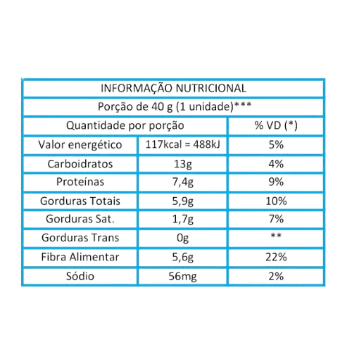 Ingredientes: Mistura de farinhas integrais (trigo, centeio, aveia, linhaça, girassol, gergelim e soja), ovo, gordura vegetal, nozes, extrato de soja, amido, farinha integral de soja, espessante: polidextrose, umectantes: sorbitol e glicerina, estabilizantes: maltitol, goma guar e goma xantana, emulsificantes: lecitina de soja e mono e diglicerídeos de ácidos graxos, fermentos químicos: bicarbonato de sódio e pirofosfato ácido de sódio, aromatizantes, conservadores: propionato de sódio e sorbato de potássio, edulcorante natural: glicosídeos de esteviol (Stévia).
