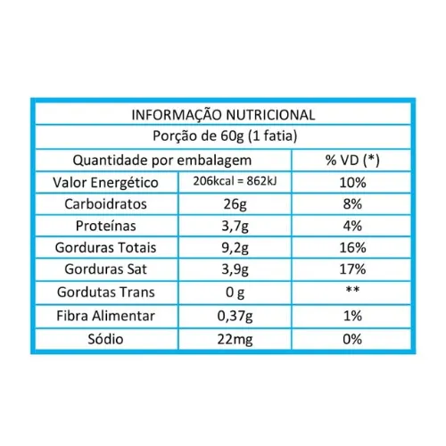 Ingredientes: Farinha de trigo enriquecida com ferro e ácido fólico, ovo, gordura vegetal, leite em pó desnatado, amido, polpa de laranja, espessante: polidextrose, umectantes: sorbitol e glicerina, estabilizantes: maltitol, goma guar, goma xantana, fermentos químicos: bicarbonato de sódio e pirofosfato ácido de sódio, emulsificantes: mono e diglicerídeos de ácidos graxos e lecitina de soja, conservadores: propionato de sódio e sorbato de potássio, aromatizante, edulcorantes: acesulfame de potássio e sucralose.