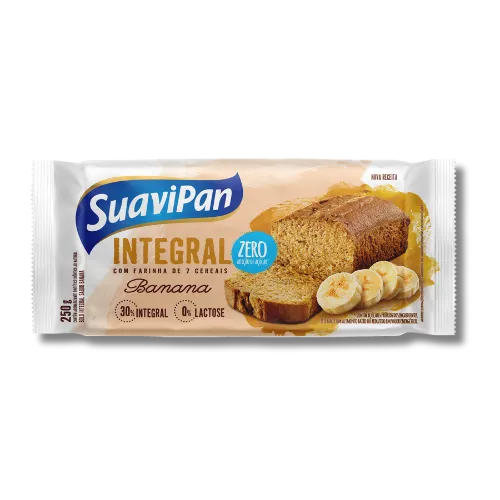 O Bolo Integral Zero Açúcar de Banana Suavipané a combinação perfeita de nutrição e sabor. Faz parte da linha integral, que se destaca por ser benéfica quando consumida de forma equilibrada. O bolo é preparado com zero gordura trans, zero lactose e é adoçado com açúcar mascavo, além de conter óleo de canola. A receita é composta por um mix nutritivo de 7 farinhas integrais: trigo, centeio, aveia, linhaça, girassol, gergelim e soja, proporcionando uma opção rica em fibras e sabor.