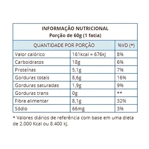 Ingredientes: Mistura de farinhas integrais (trigo, centeio, aveia, linhaça, girassol, gergelim e soja), ovo, purê de banana, gordura vegetal, óleo de canola, extrato de soja, amido, espessante: polidextrose, umectantes: sorbitol e glicerina, estabilizantes: maltitol, goma guar e goma xantana, emulsificantes: lecitina de soja e mono e diglicerídios de ácidos graxos, fermentos químicos: bicarbonato de sódio e pirofosfato ácido de sódio, aromatizante, conservadores: propionato de sódio e sorbato de potássio, edulcorante natural: glicosídeos de esteviol (stevia).