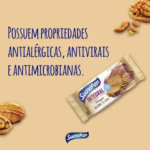 O Bolo Integral Zero Açúcar de Nozes Suavipané a combinação perfeita de nutrição e sabor. Faz parte da linha integral, conhecida por seus ingredientes selecionados e equilibrados. Com zero gordura trans e zero lactose, é adoçado com açúcar mascavo e preparado com óleo de canola. Sua receita inclui um mix nutritivo de 7 farinhas integrais: trigo, centeio, aveia, linhaça, girassol, gergelim e soja, além de deliciosas nozes, proporcionando uma opção rica em fibras e sabor.