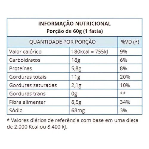 Ingredientes: Mistura de farinhas integrais (trigo, centeio, aveia, linhaça, girassol, gergelim e soja), ovo, gordura vegetal, nozes, óleo de canola, extrato de soja, amido, espessante: polidextrose, umectantes: sorbitol e glicerina, estabilizantes: maltitol, goma guar e goma xantana, emulsificantes: lecitina de soja e mono e diglicerídios de ácidos graxos, fermentos químicos: bicarbonato de sódio e pirofosfato ácido de sódio, aromatizante, conservadores: propionato de sódio e sorbato de potássio, edulcorante natural: glicosídeos de esteviol (stevia).