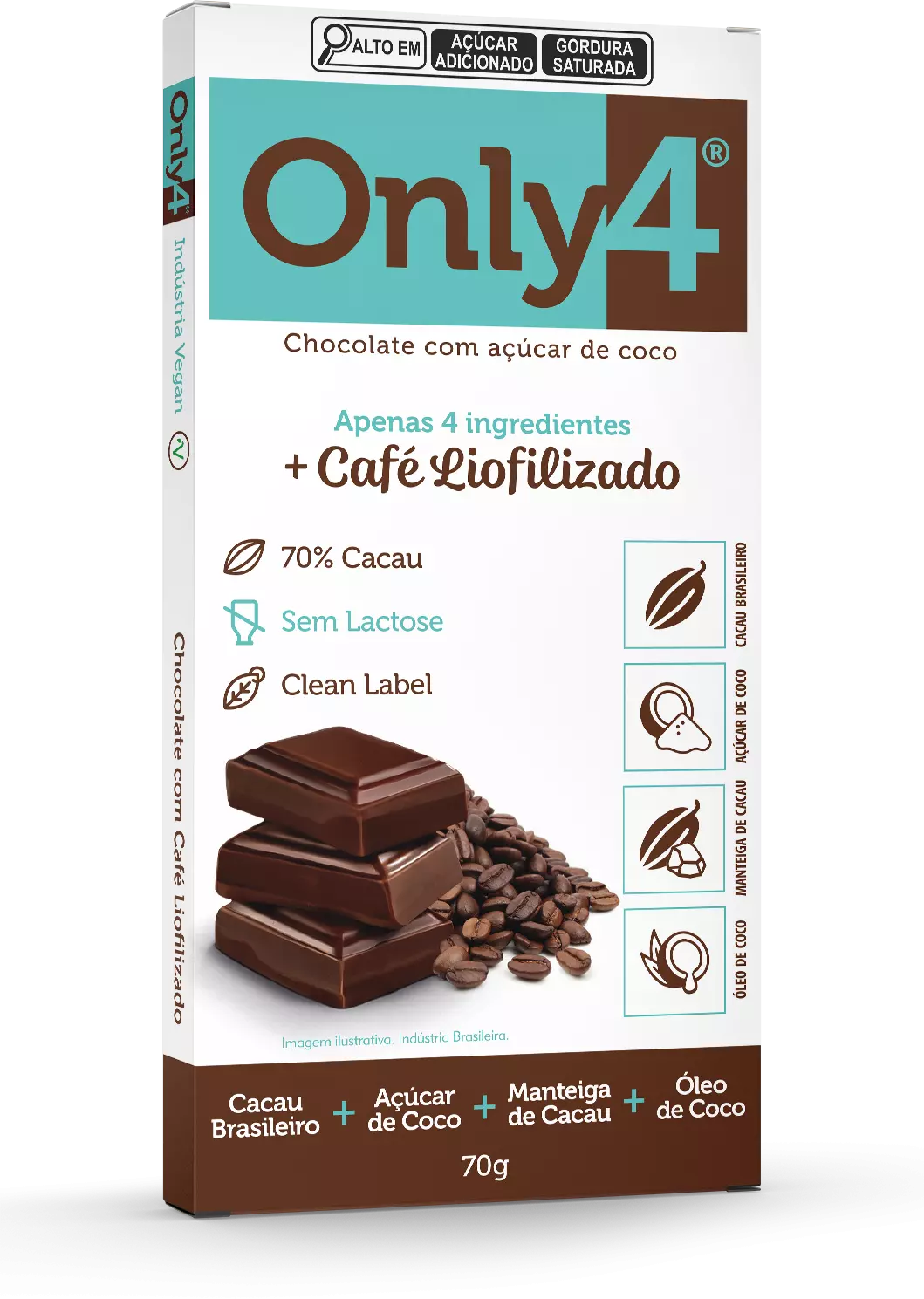 Ingredientes: massa de cacau, açúcar de coco, manteiga de cacau, óleo de coco e café liofilizado. NÃO CONTÉM GLÚTEN