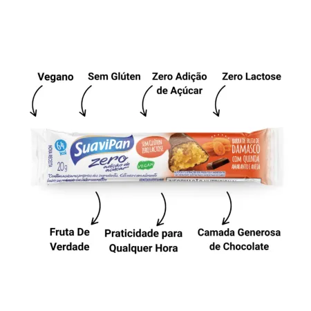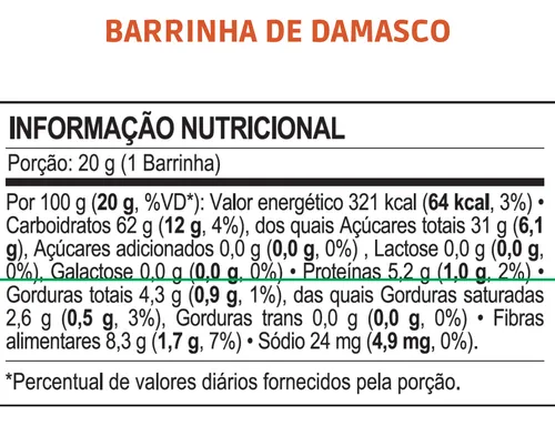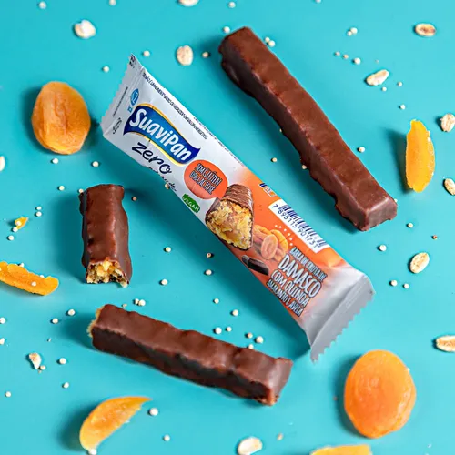 Ingredientes: Damasco seco, farinha integral de quinoa, farinha integral de aveia, farinha integral de amaranto, amido, cobertura sabor chocolate (gordura fracionada, maltodextrina, cacau em pó, extrato de soja, massa de cacau, edulcorante: maltitol, emulsificantes: lecitina de soja e poliglicerol polirricinoleato de glicerina, edulcorantes: sucralose e aromatizantes), gordura vegetal, sal, estabilizante: maltitol, espessantes: goma acácia e polidextrose, emulsificante: lecitina de soja, aromatizante, antioxidante: tocoferol, acidulante: ácido cítrico, edulcorantes: sucralose e acessulfame K, conservadores: propionato de sódio e sorbato de potássio.
