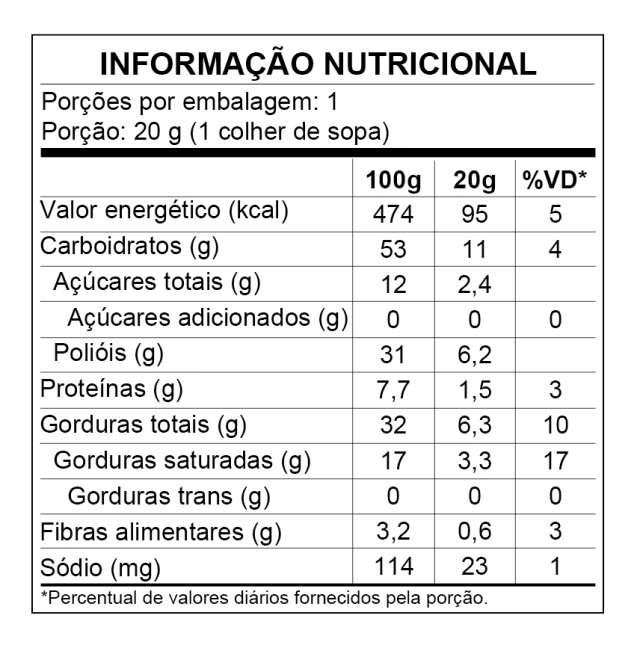 Ingredientes: Gordura vegetal, cobertura sabor chocolate meio amargo, leite desnatado em pó, soro de leite em pó, grânulos crocantes sabor caramelo zero açúcar, pistache moído, proteína concentrada do soro de leite, edulcorantes maltitol e stevia, emulsificantes lecitina de soja e polirricinoleato de poliglicerol, aromatizantes e corante clorofila. NÃO CONTÉM GLÚTEN.