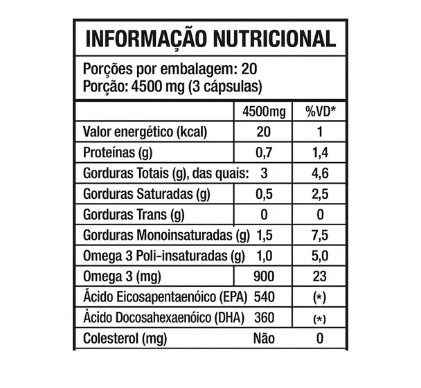INGREDIENTES : Óleo de Peixe (Ômega 3). Composição da cápsula: Gelatina e Glicerina.