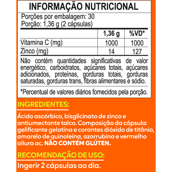 ALTO TEOR DE ZINCO E VITAMINA C. A Vitamina C e o Zinco auxiliam no funcionamento do sistema imune. A Vitamina C é um antioxidantes que auxilia na proteção dos danos causados pelos radicais livres, no metabolismo energético, de proteínas e de gorduras. O Zinco auxilia na visão e no metabolismo da Vitamina A, na síntese de proteínas e na manutenção dos ossos.