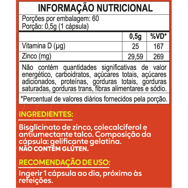 1 cápsula contém 28,0 mg de Zinco (400% IDR) + 25 mcg (1000UI) de Vitamina D (500% IDR).v
