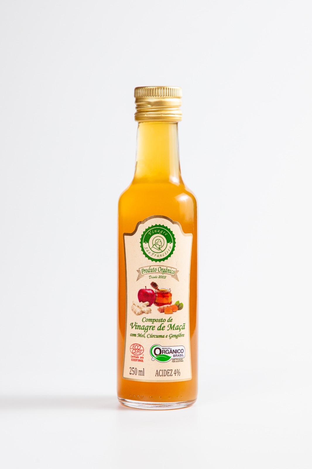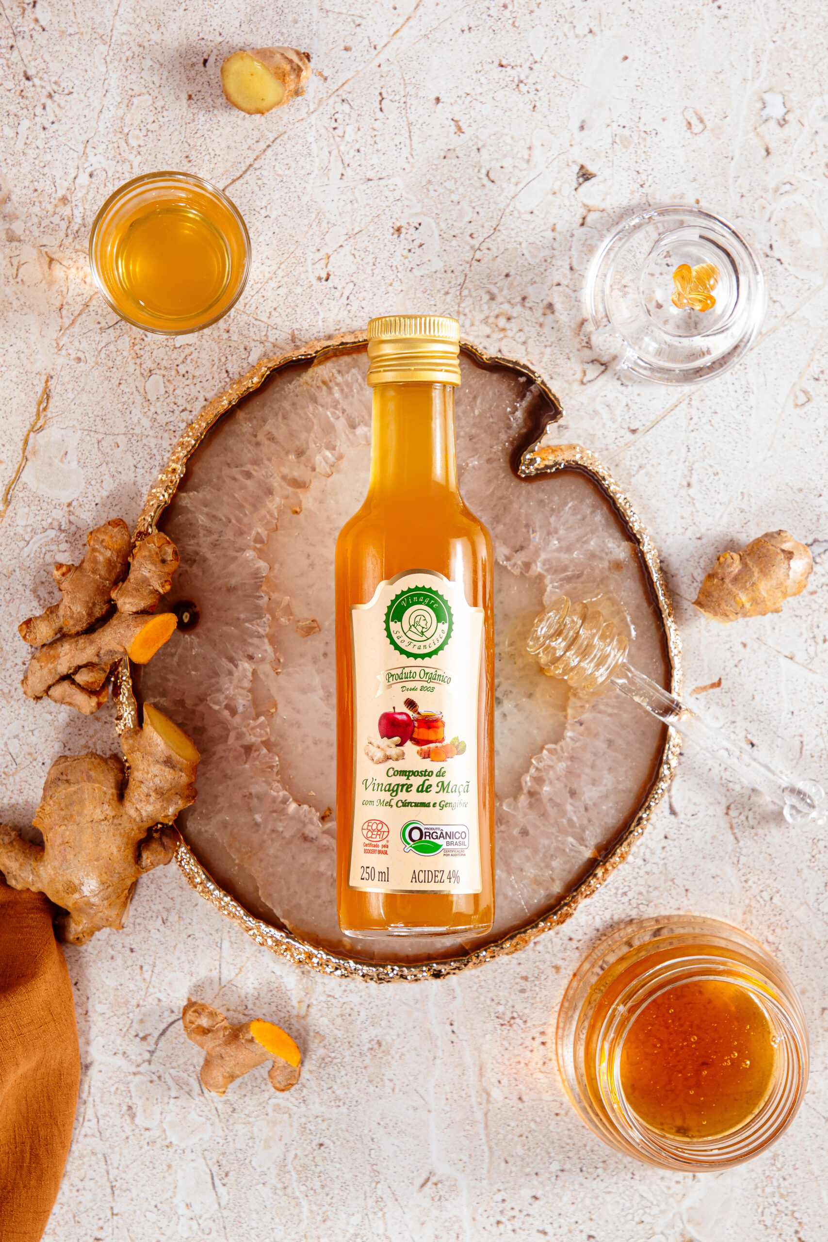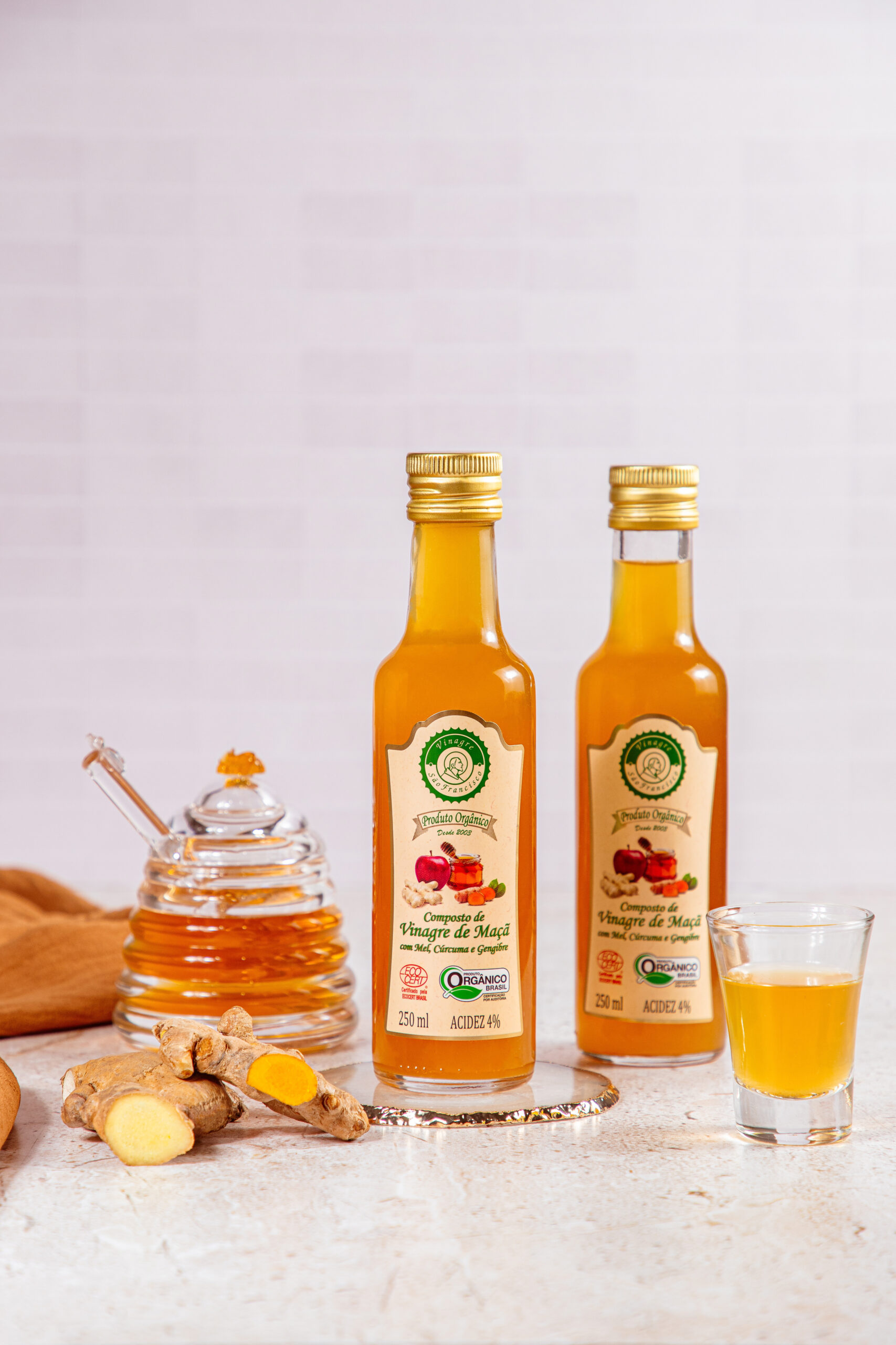 - Ingredientes: Maçã, gengibre, cúrcuma, mel orgânicos.