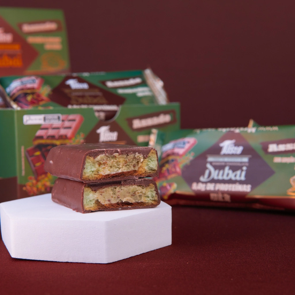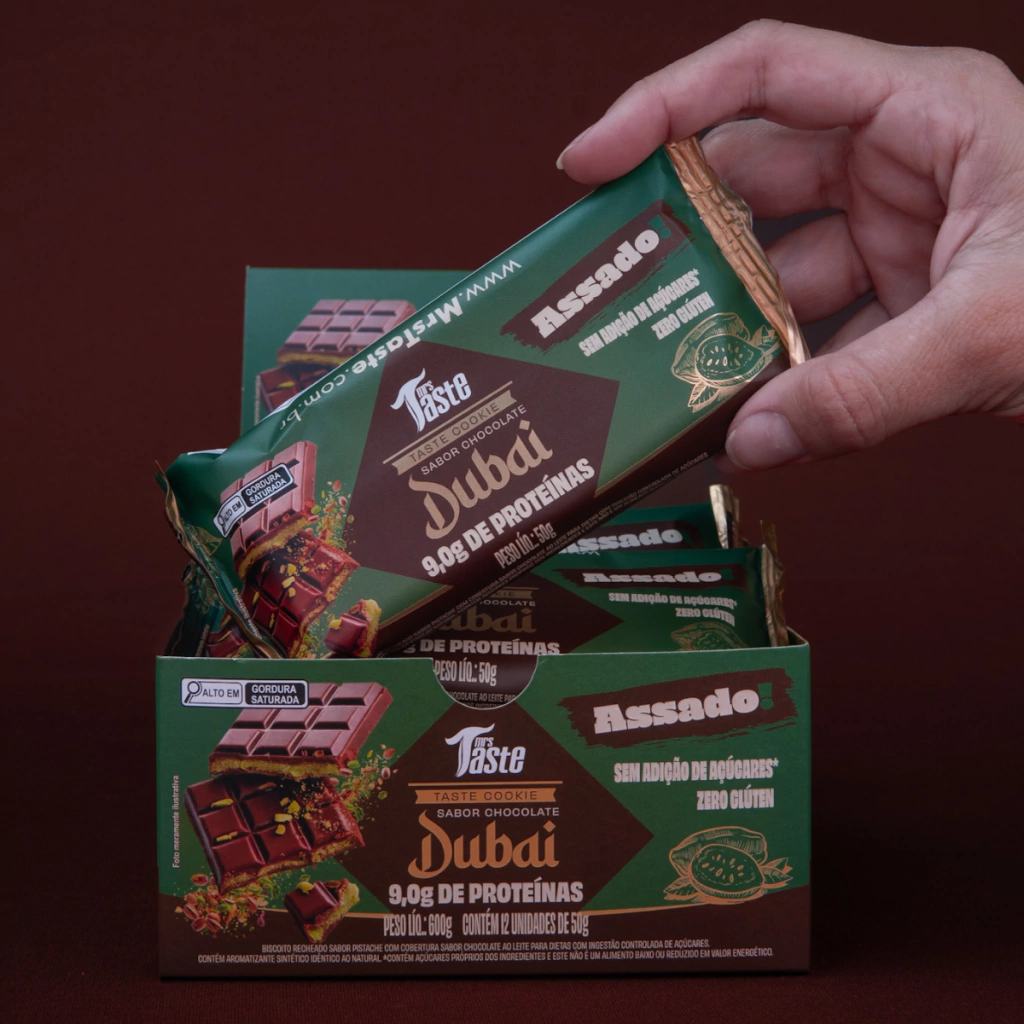 Taste Cookie Bar Chocolate Dubai Assada com 9g de Proteína e Sem Glúten. Biscoito recheado sabor pistache com cobertura sabor chocolate ao leite para dietas com ingestão controlada de açúcares.