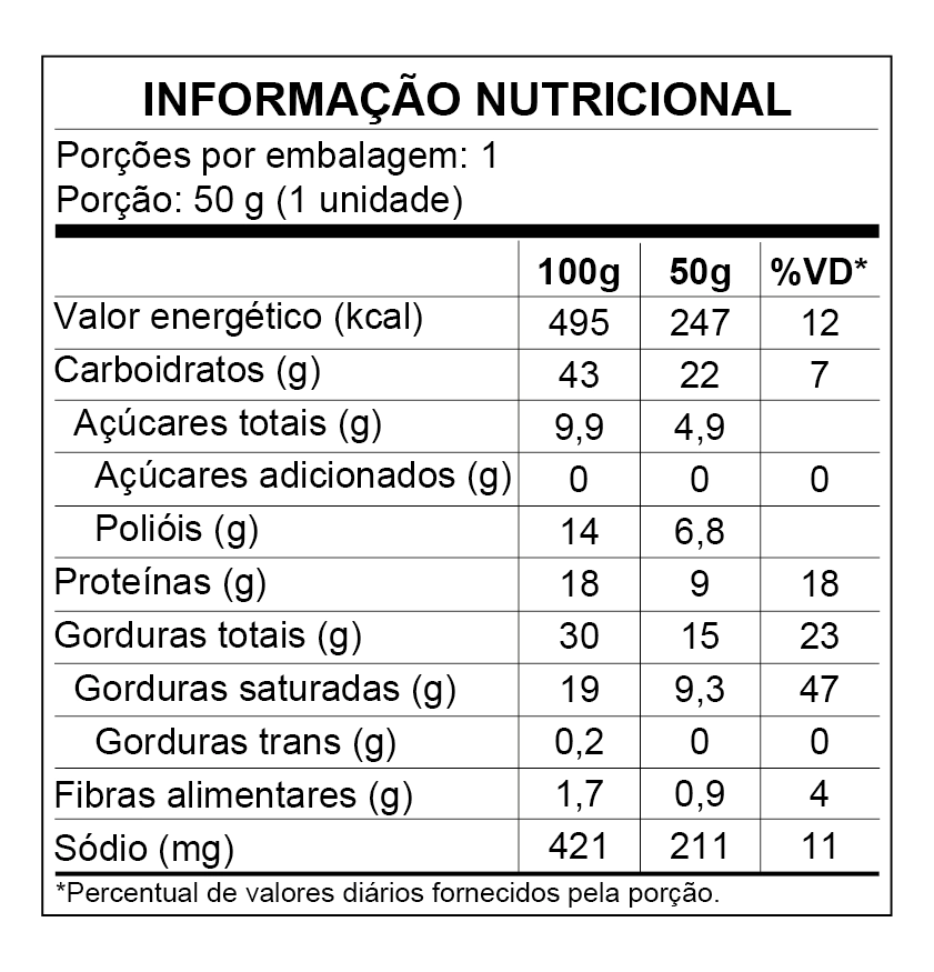 Ingredientes: Cobertura proteica sabor queijo, gordura vegetal, maltitol, leite desnatado em pó, amido de mandioca, farinha de arroz, proteína concentrada do soro de leite, queijo em pó, sal, polidextrose, pimenta branca, aromatizantes, emulsificantes lecitina de soja e polirricinoleato de poliglicerol e espessante goma xantana. NÃO CONTÉM GLÚTEN. CONTÉM LACTOSE.